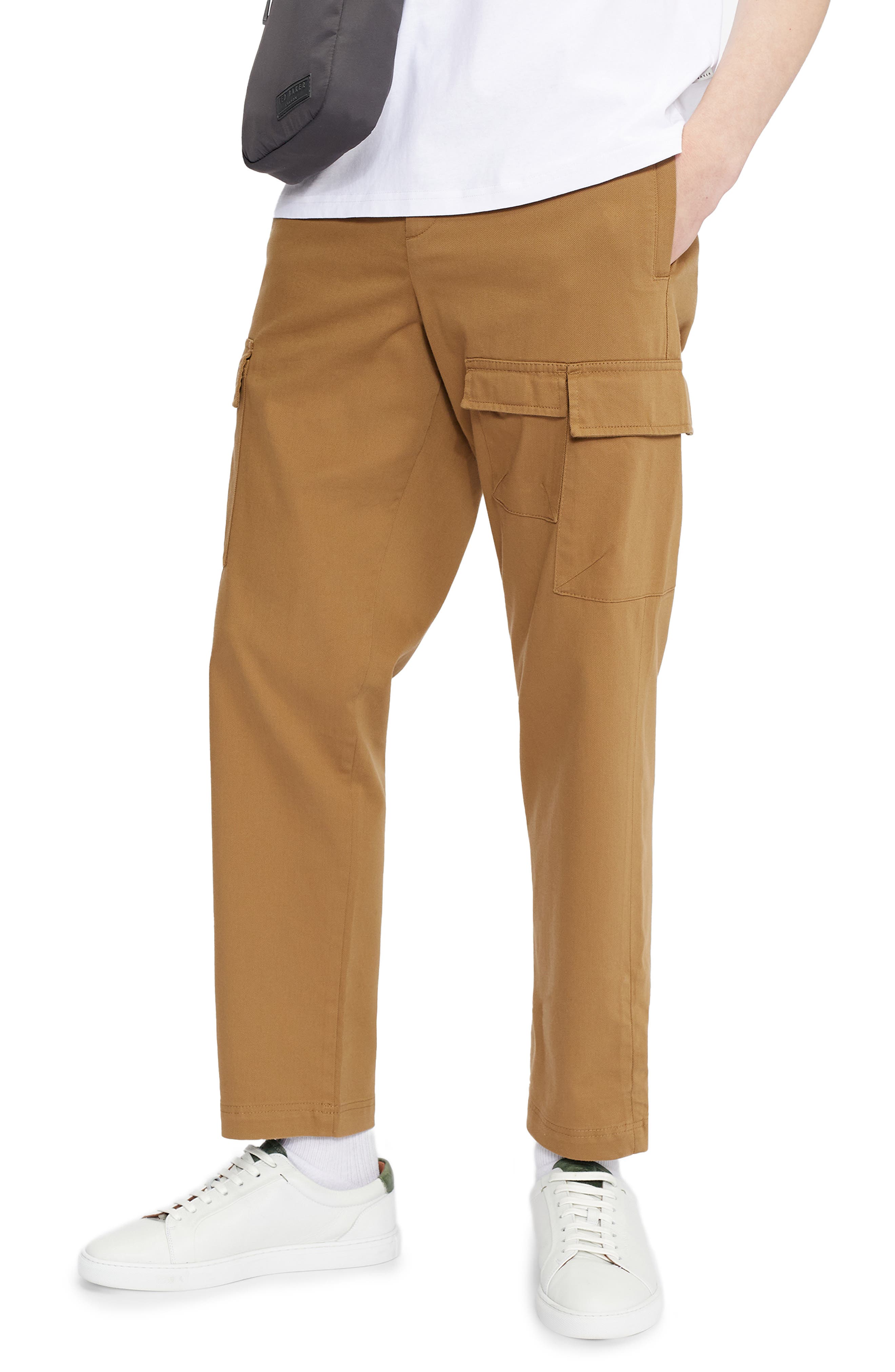 Cut with a cropped leg that tapers to the ankle elasticated waist and two angled side-pockets.